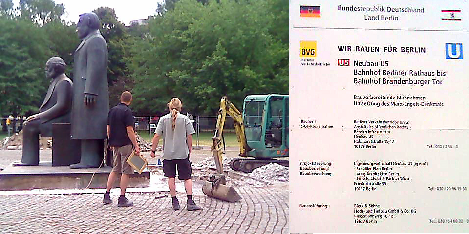 Tatsächlich ist Marx `und Engels philosophisches Gedankengut im Angesicht der weltweiten Finanzkrise in aller Munde und im Sommer 2010 soll das originale Denkmal von Ludwig Engelhardt an den Rand des Forums geschoben werden, um Eingängen für eine neue U-Bahn Linie Platz zu machen. Im Schatten der Lindenbäume werden sie zu Augenzeugen des Wiederaufbaus des Berliner Stadtschlosses.