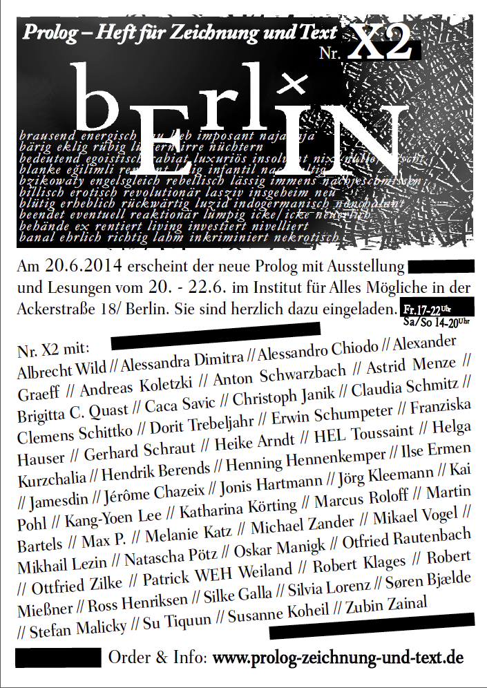 Am 20.6.2014 erscheint der neue Prolog mit Ausstellung und Lesungen vom 20. – 22.6. im Institut für Alles Mögliche in der Ackerstraße 18/ Berlin.
