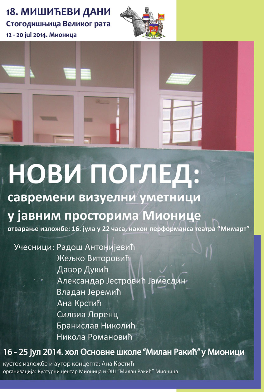 The exhibition “Novi pogled: savremeni vizuelni umetnici u javnim prostorima Mionice” (“New Perspectives: contemporary visual artists in public spaces of Mionica”) from 16.-25.7.2014 takes place in the context of the Festival “Mišićevi Dani” and the remembrance of the 100th anniversary of the beginning of World War 1.