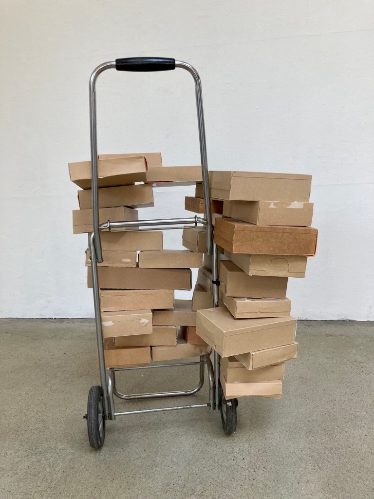 Silvia Lorenz uses the modes of action of collection, deplacement and improvisation. Whether in urban or rural spaces, man-made transport and material cycles are the starting point for her objects and interventions. The perspective from the outside and from above intertwines with the analytical view of what is happening. Existential, economic and ecological questions are reflected in Silvia Lorenz’s sculptural interventions. The use of reused materials, often collected on site, forms the core of the practice. Layers of posters pasted on top of each other, whose original message is no longer recognisable, can become the trigger and material just as much as the metal and construction site remnants for the “Tumbleweeds” (installation for INFECTED REALITIES, WK 2020, among others) or as the multi-coloured drink lids that have collected on the street corners of big cities. “For me a form of street art, at the same time also a contemporary mosaic.” Silvia Lorenz (the trigger was formed by discarded lids … Pixel collections outside on the roadside, just as petrol forms shimmering stains in puddles). Cardboard packaging acts as mini bricks, soft bricks, in the sense of “soft sculpture” They are mounted on movable transport objects, forming mobile sculptures in space. The artist has also realised many projects in public space in Neukölln.