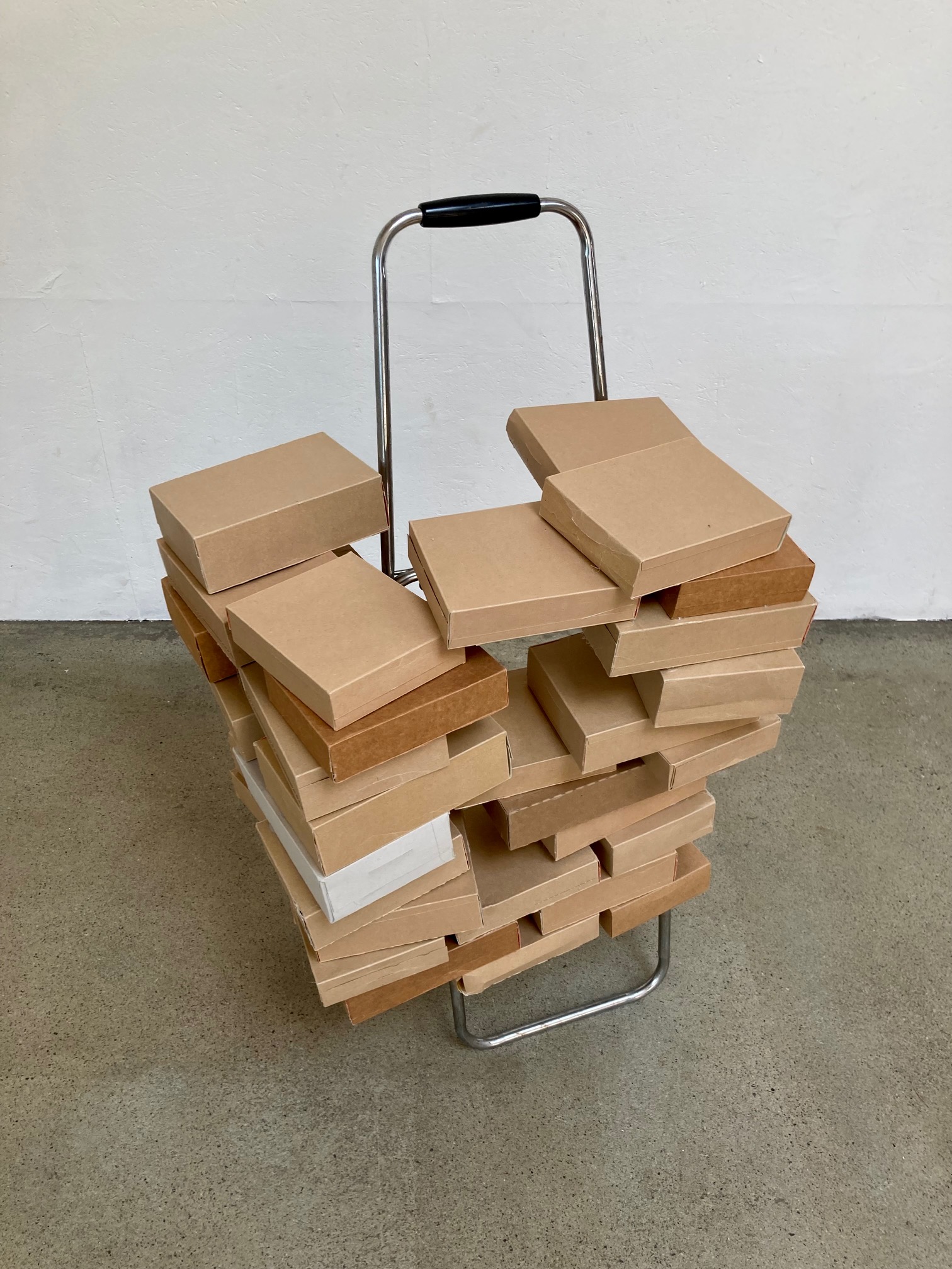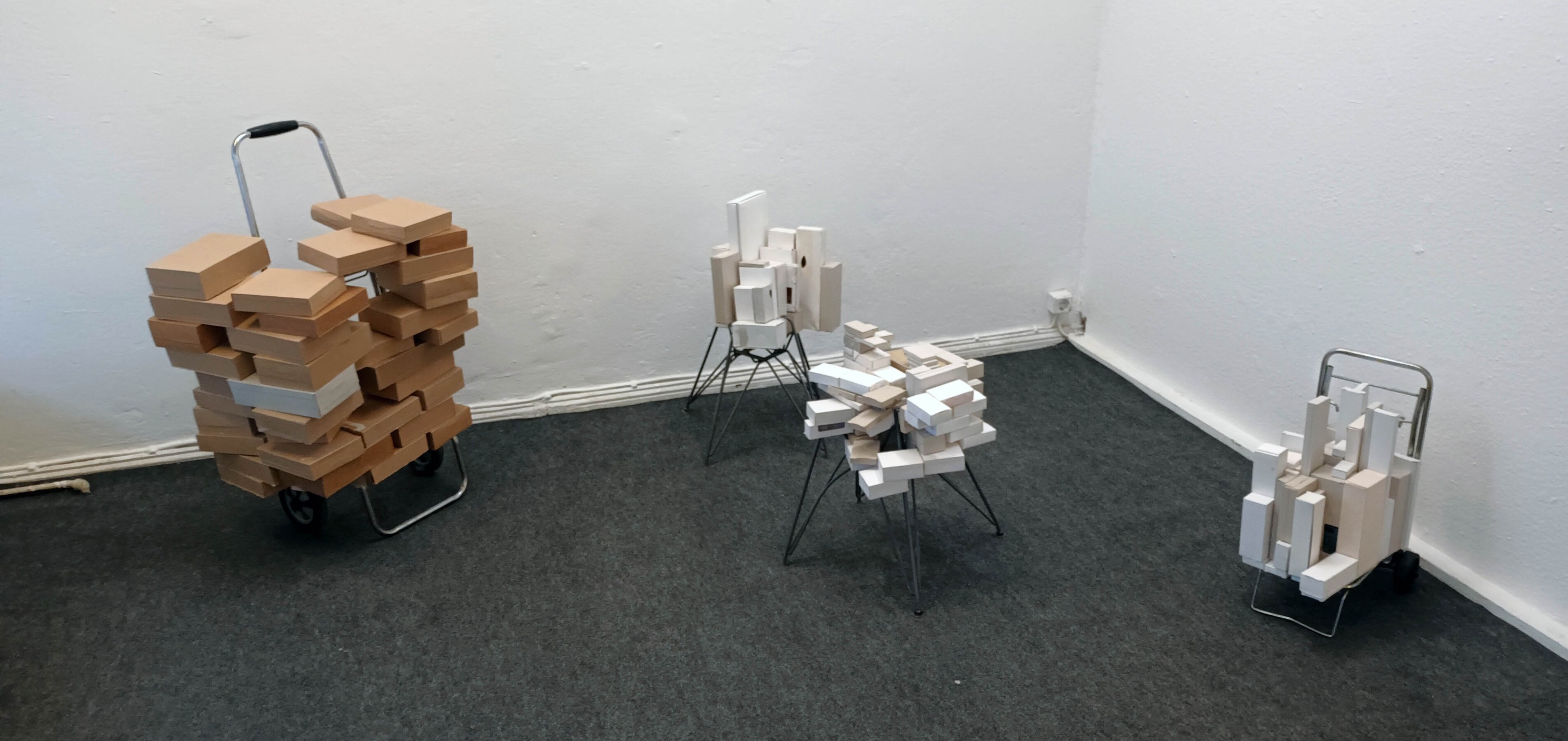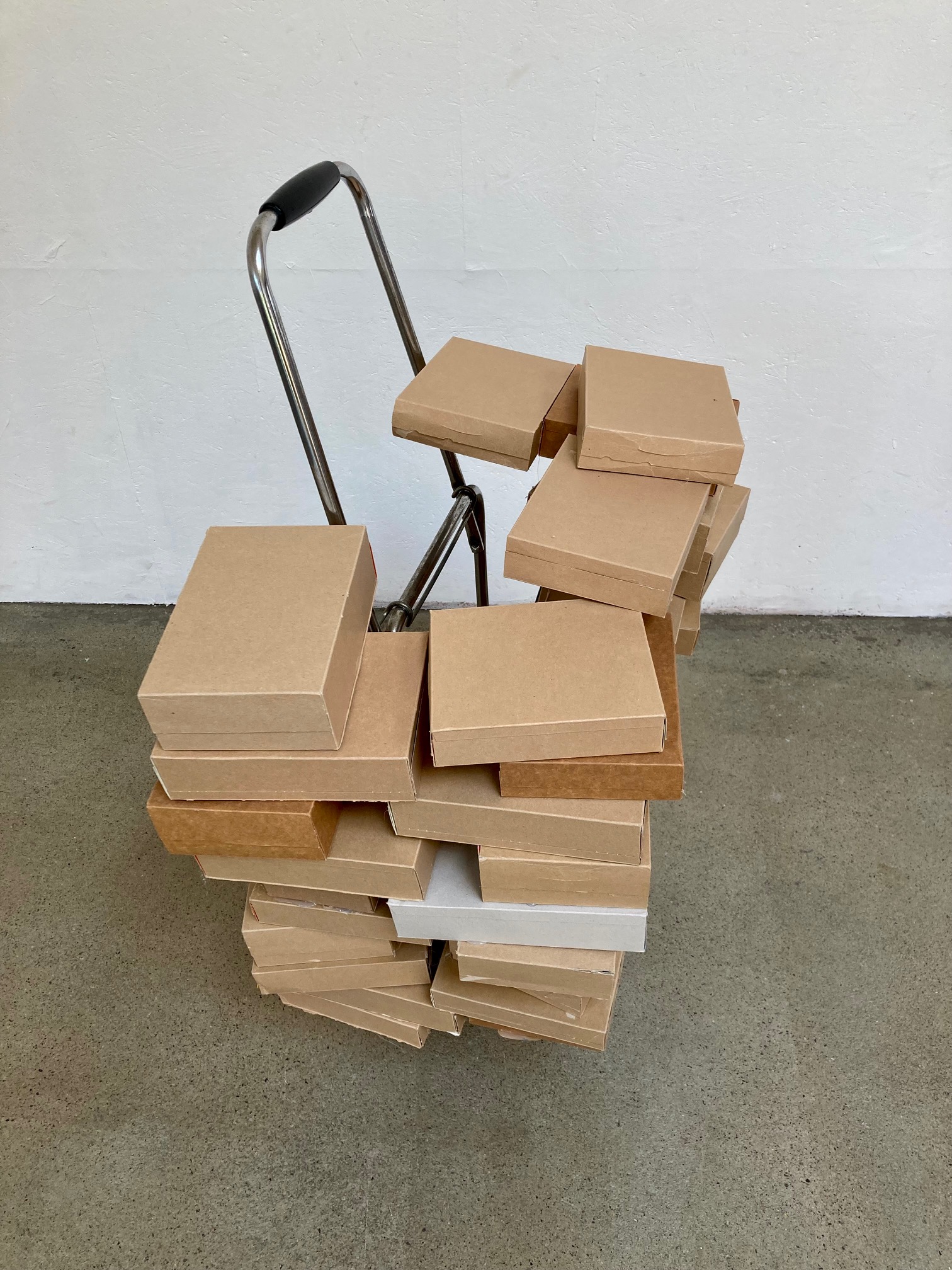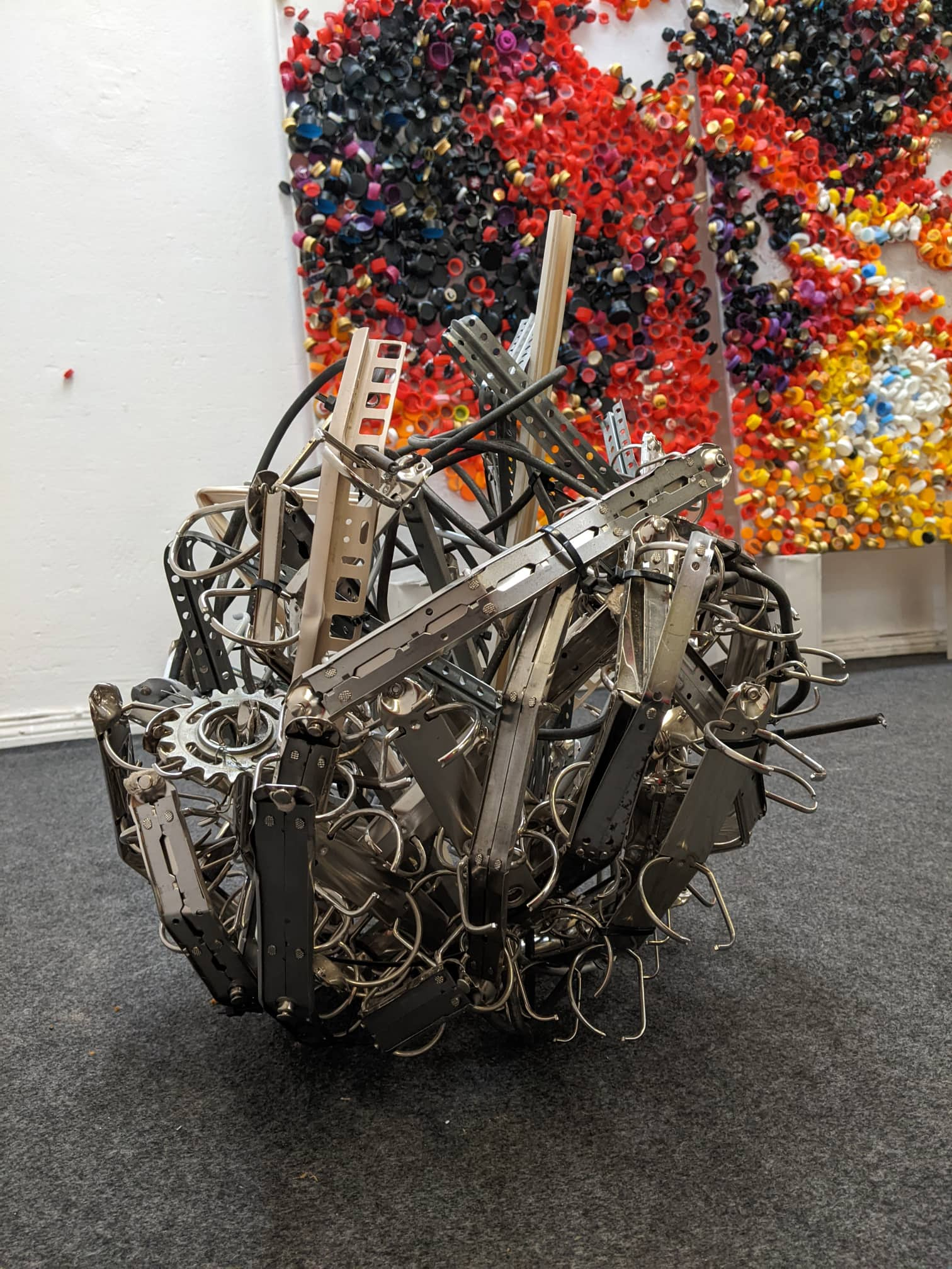 Silvia Lorenz uses the modes of action of collection, deplacement and improvisation. Whether in urban or rural spaces, man-made transport and material cycles are the starting point for her objects and interventions. The perspective from the outside and from above intertwines with the analytical view of what is happening. Existential, economic and ecological questions are reflected in Silvia Lorenz’s sculptural interventions. The use of reused materials, often collected on site, forms the core of the practice. Layers of posters pasted on top of each other, whose original message is no longer recognisable, can become the trigger and material just as much as the metal and construction site remnants for the “Tumbleweeds” (installation for INFECTED REALITIES, WK 2020, among others) or as the multi-coloured drink lids that have collected on the street corners of big cities. “For me a form of street art, at the same time also a contemporary mosaic.” Silvia Lorenz (the trigger was formed by discarded lids … Pixel collections outside on the roadside, just as petrol forms shimmering stains in puddles). Cardboard packaging acts as mini bricks, soft bricks, in the sense of “soft sculpture” They are mounted on movable transport objects, forming mobile sculptures in space. The artist has also realised many projects in public space in Neukölln.