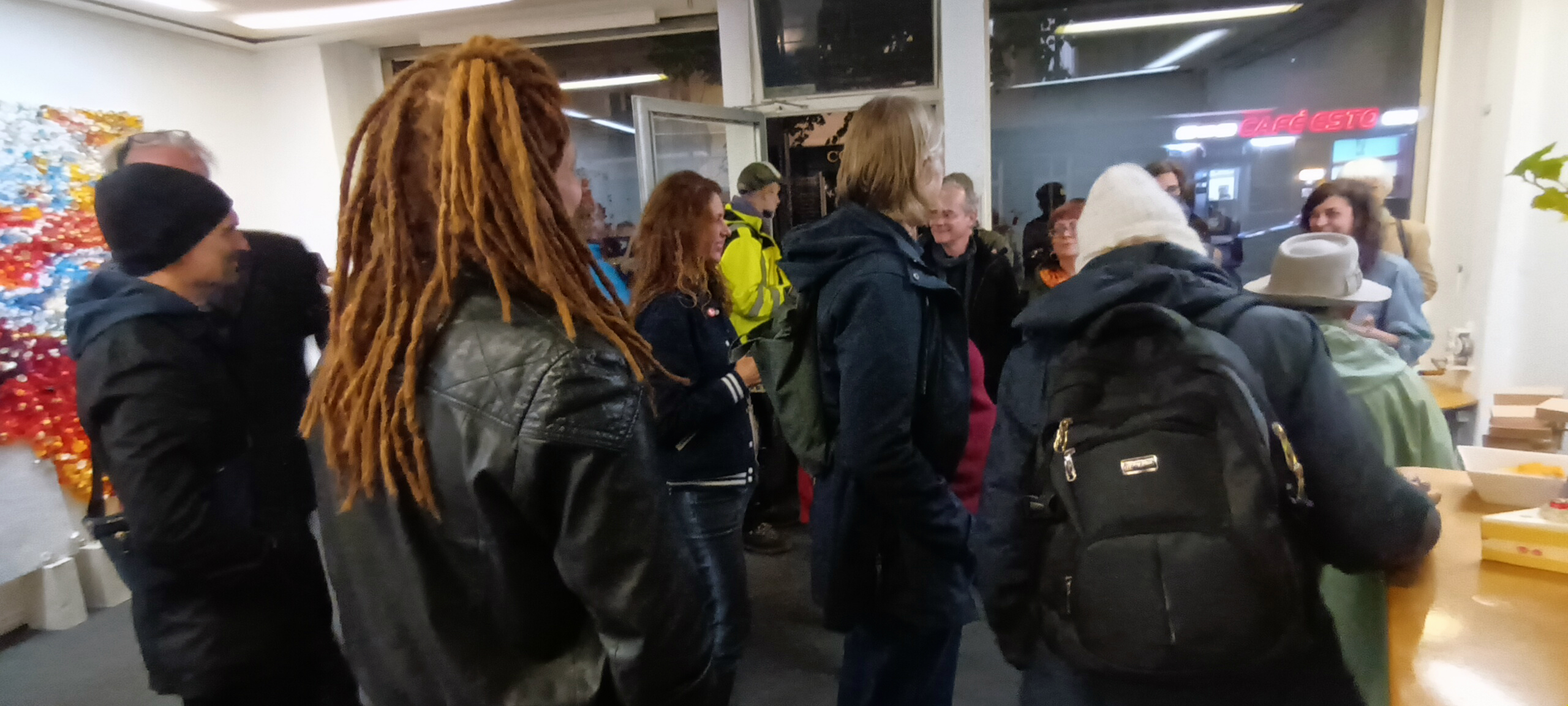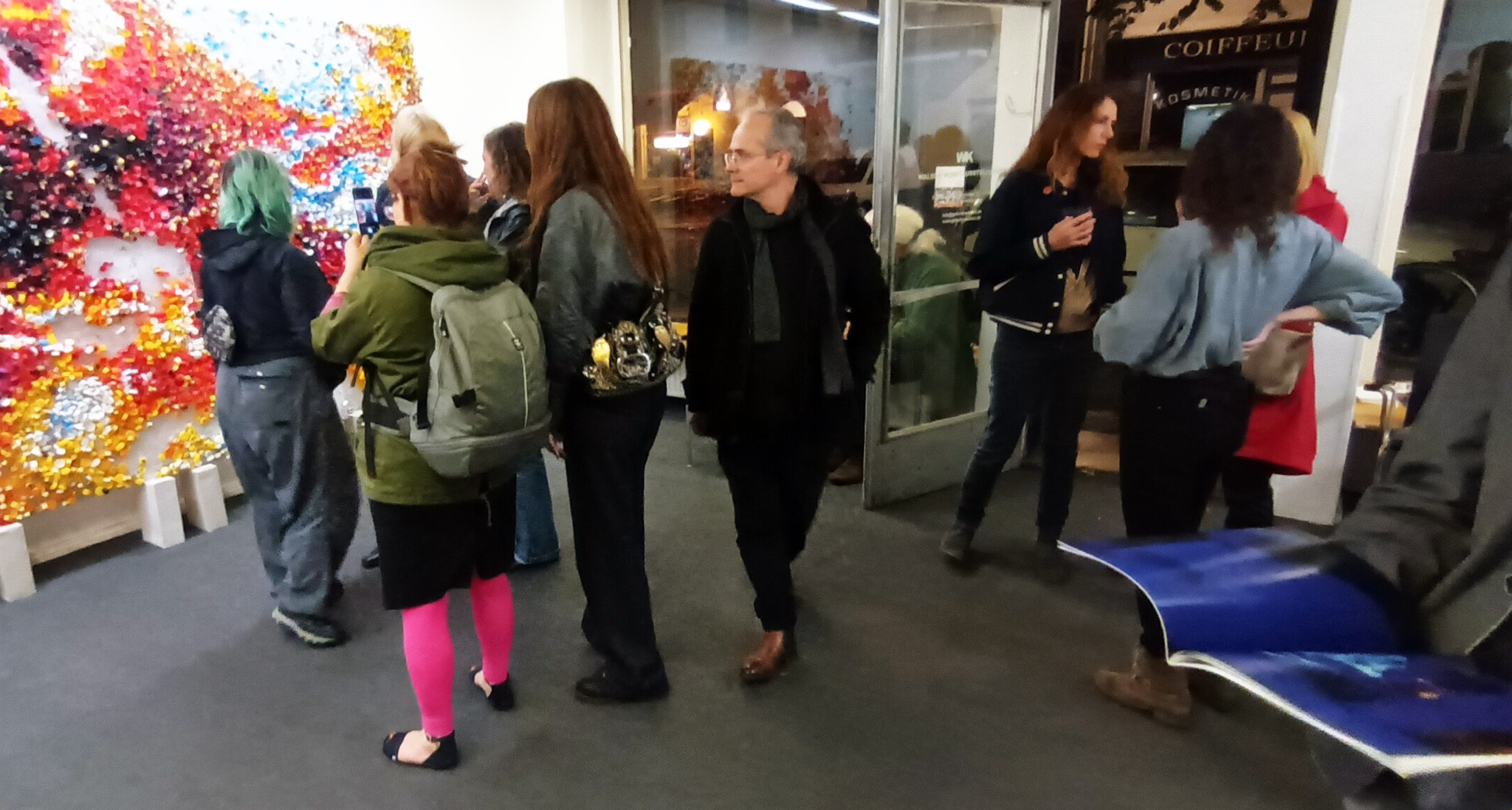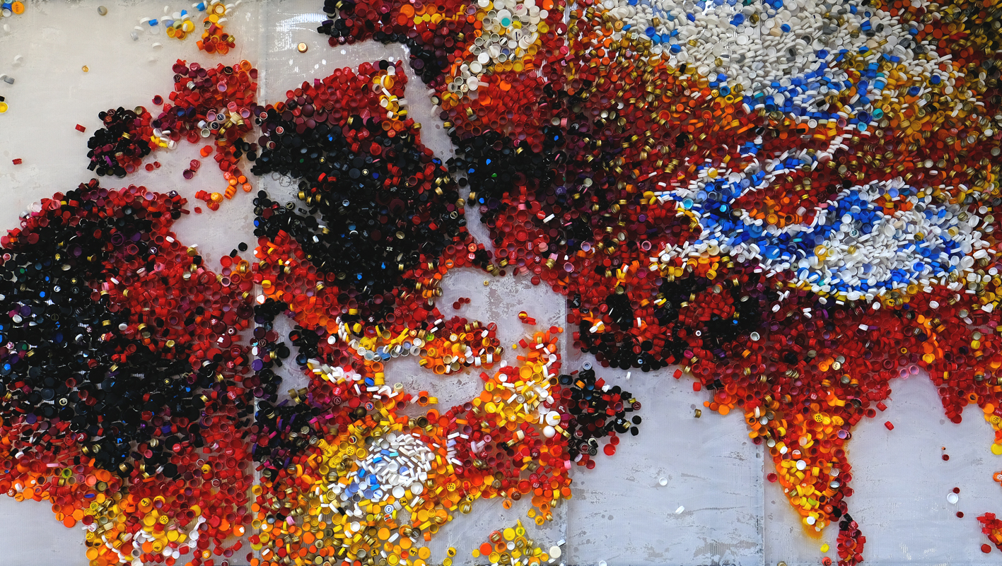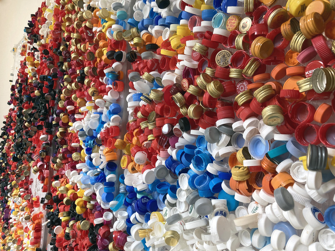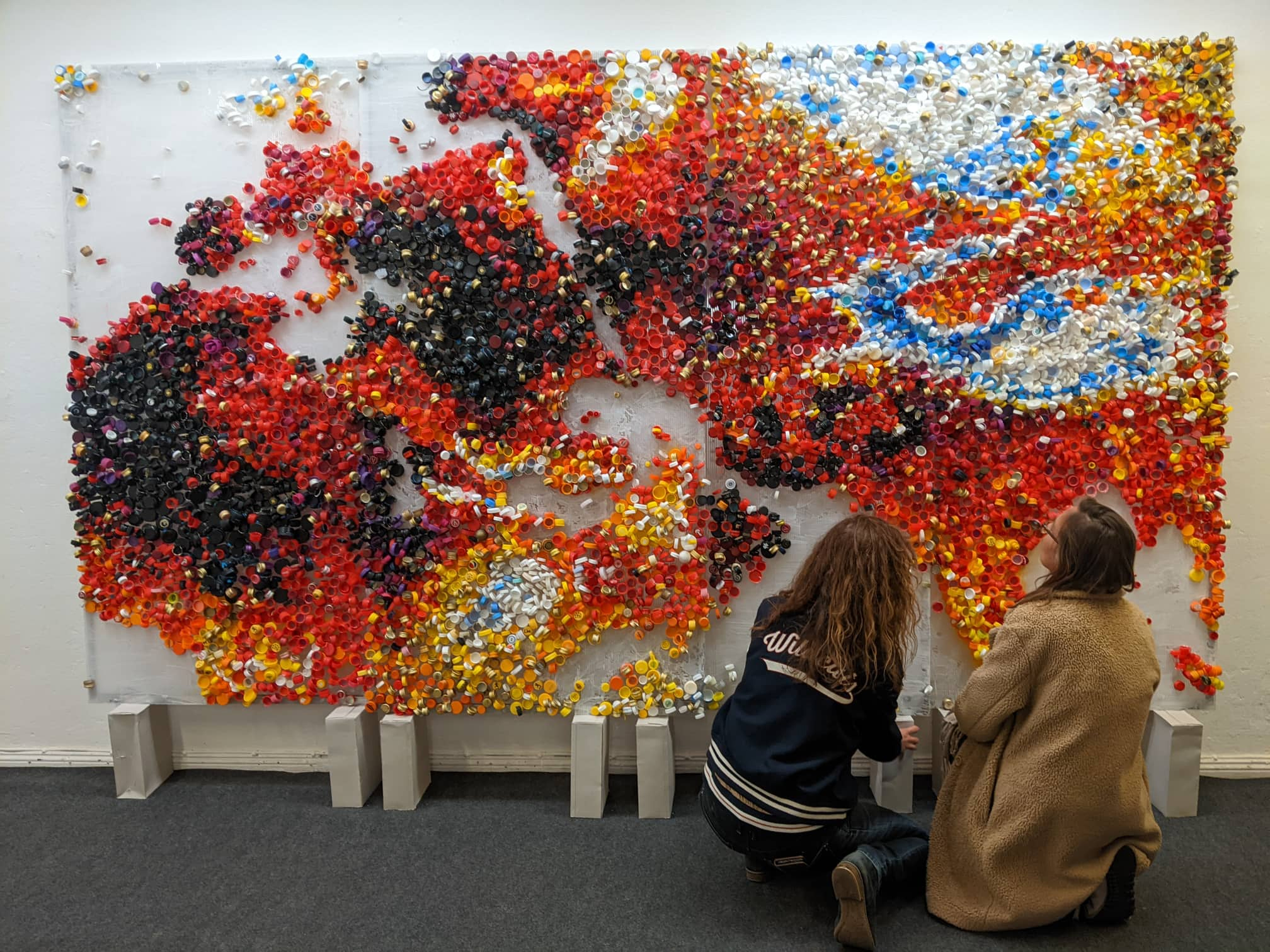 Silvia Lorenz uses the modes of action of collection, deplacement and improvisation. Whether in urban or rural spaces, man-made transport and material cycles are the starting point for her objects and interventions. The perspective from the outside and from above intertwines with the analytical view of what is happening. Existential, economic and ecological questions are reflected in Silvia Lorenz’s sculptural interventions. The use of reused materials, often collected on site, forms the core of the practice. Layers of posters pasted on top of each other, whose original message is no longer recognisable, can become the trigger and material just as much as the metal and construction site remnants for the “Tumbleweeds” (installation for INFECTED REALITIES, WK 2020, among others) or as the multi-coloured drink lids that have collected on the street corners of big cities. “For me a form of street art, at the same time also a contemporary mosaic.” Silvia Lorenz (the trigger was formed by discarded lids … Pixel collections outside on the roadside, just as petrol forms shimmering stains in puddles). Cardboard packaging acts as mini bricks, soft bricks, in the sense of “soft sculpture” They are mounted on movable transport objects, forming mobile sculptures in space. The artist has also realised many projects in public space in Neukölln.