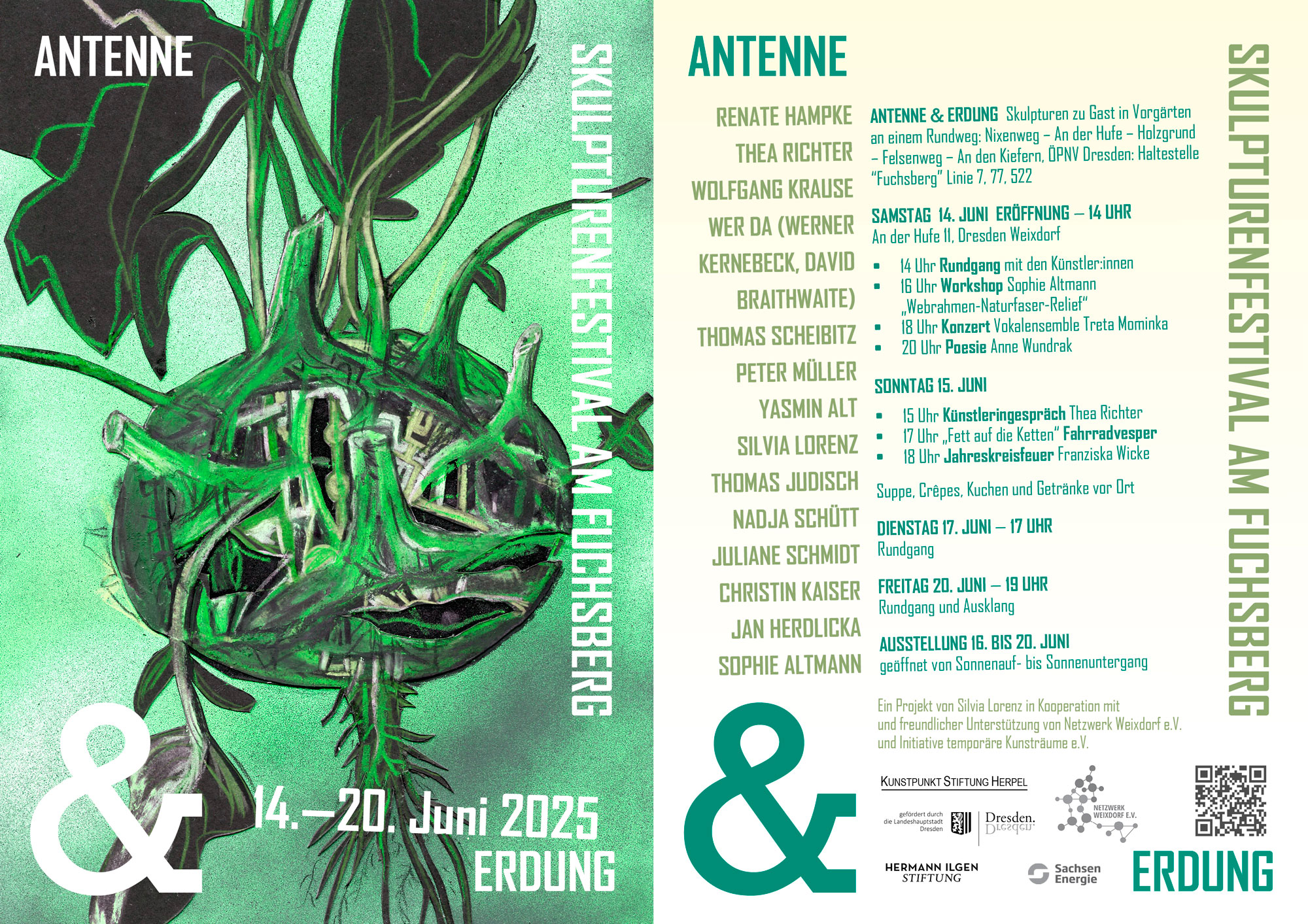 Vom 14. bis zum 20. Juni 2025 verwandeln sich einige Straßen der Fuchsbergsiedlung für das Skulpturenfestival “Antenne&Erdung” in eine lebendige Ausstellungsfläche. Skulpturen und Objekte treffen auf individuell gestaltete Vorgärten der Anwohner. Sowohl die eingeladenen Künstlerinnen und Künstler als auch die Gastgeberinnen und Gastgeber umfassen mehrere Generationen und sind zwischen 35 und 90 Jahren alt. Das Vertrauen der Anwohner vor Ort „unbekannte“ Objekte auf Zeit zu beherbergen, ist die Grundlage des gesamten Festivals. Die Skulpturen werden so in den Vorgärten platziert, dass sie von der Straße aus für alle einsehbar sind.