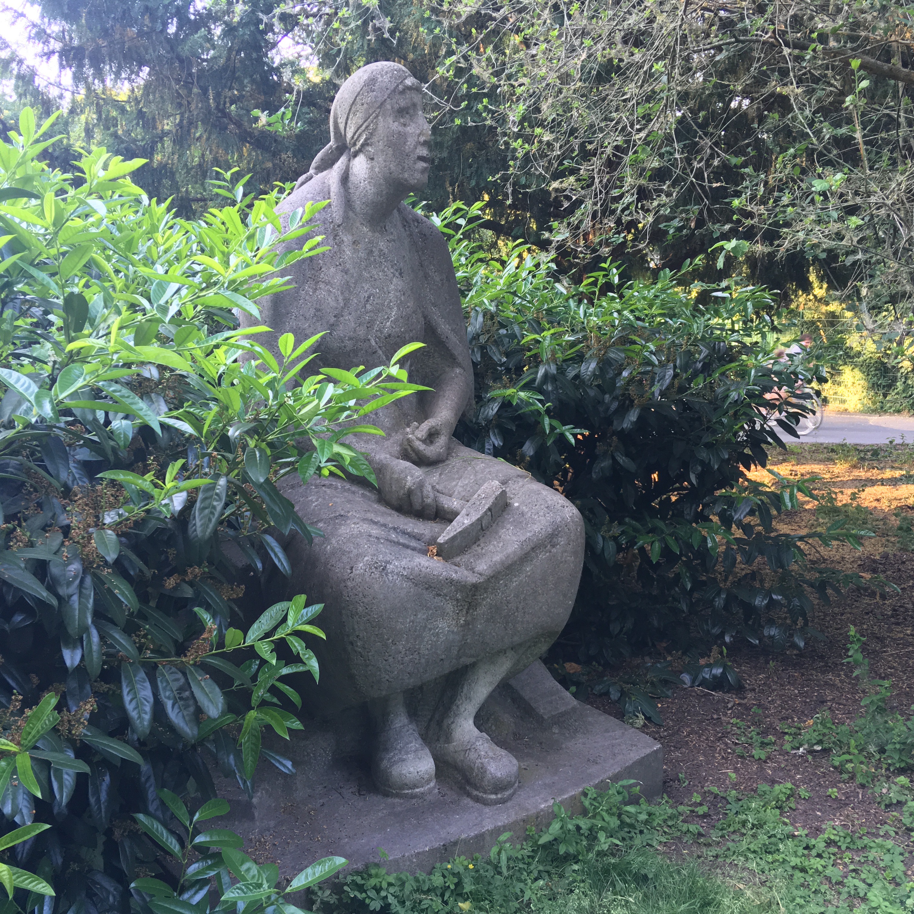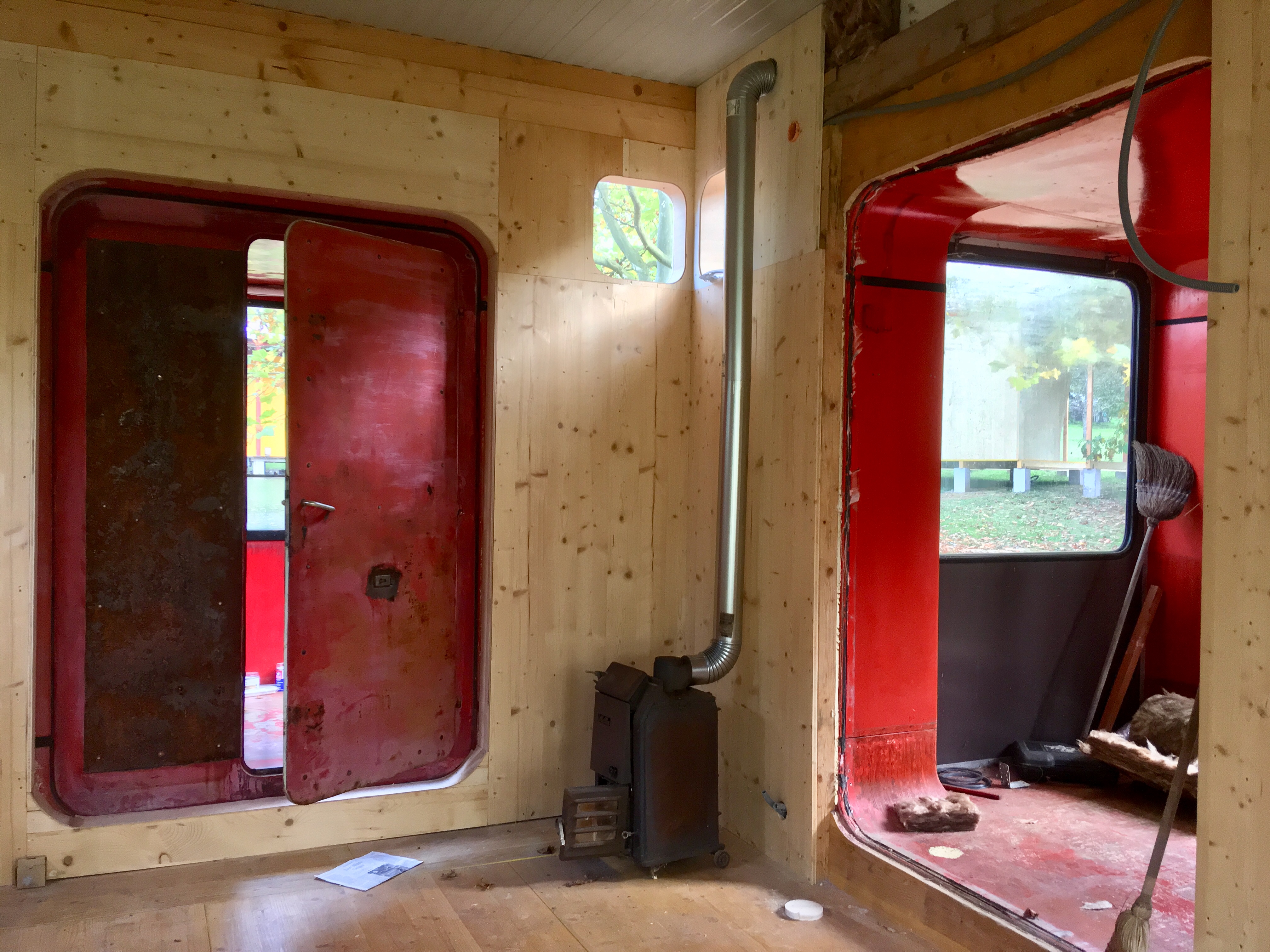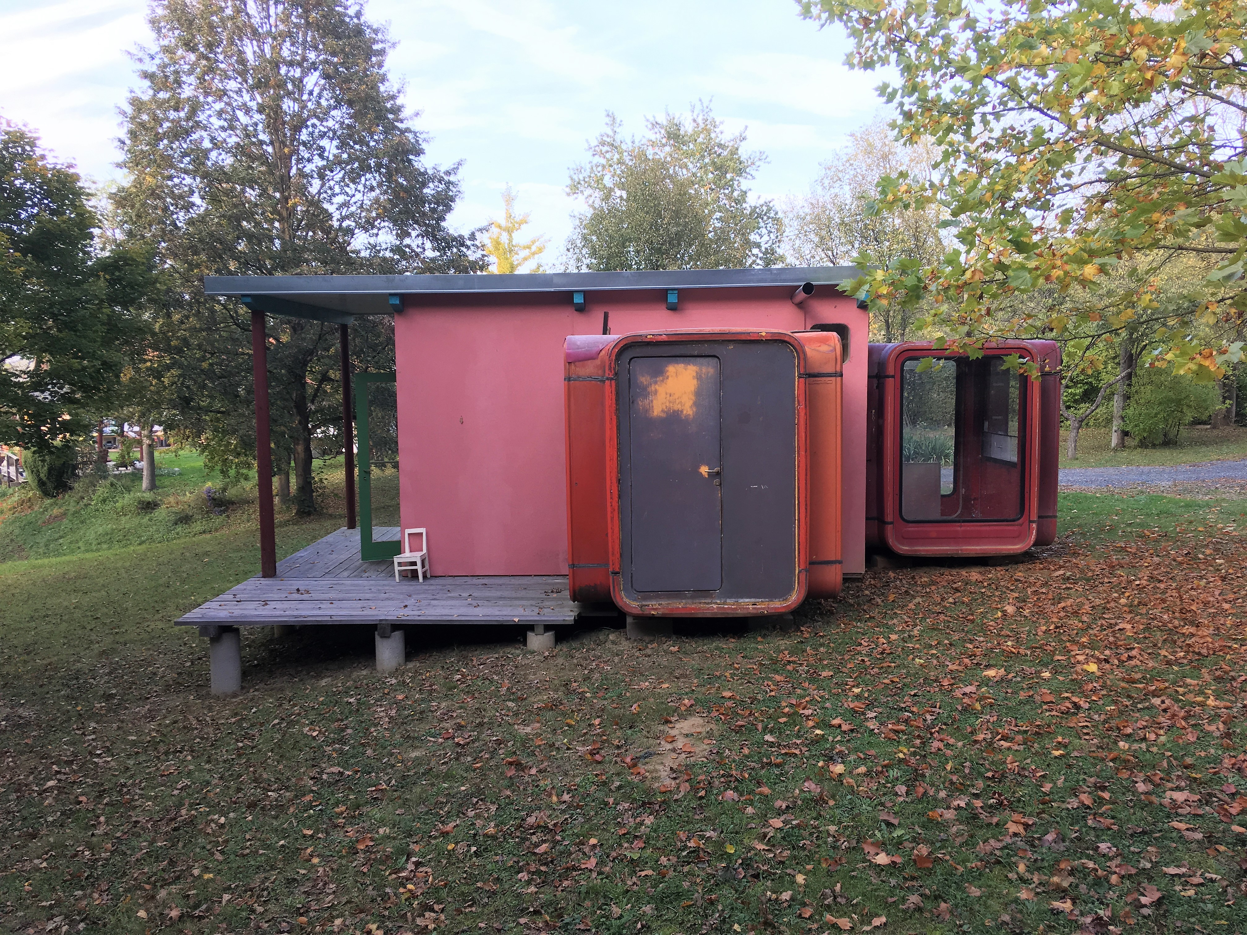 “Kioskhaus” (mit Peter Pilz), 2017-19, Land Art Eisenberg, Burgenland, Österreich // “Umschulung”, 2018, Hasenheide Berlin, 48h Neukölln – Intervention an der “Trümmerfrau” von Katharina Szelinski-Singer