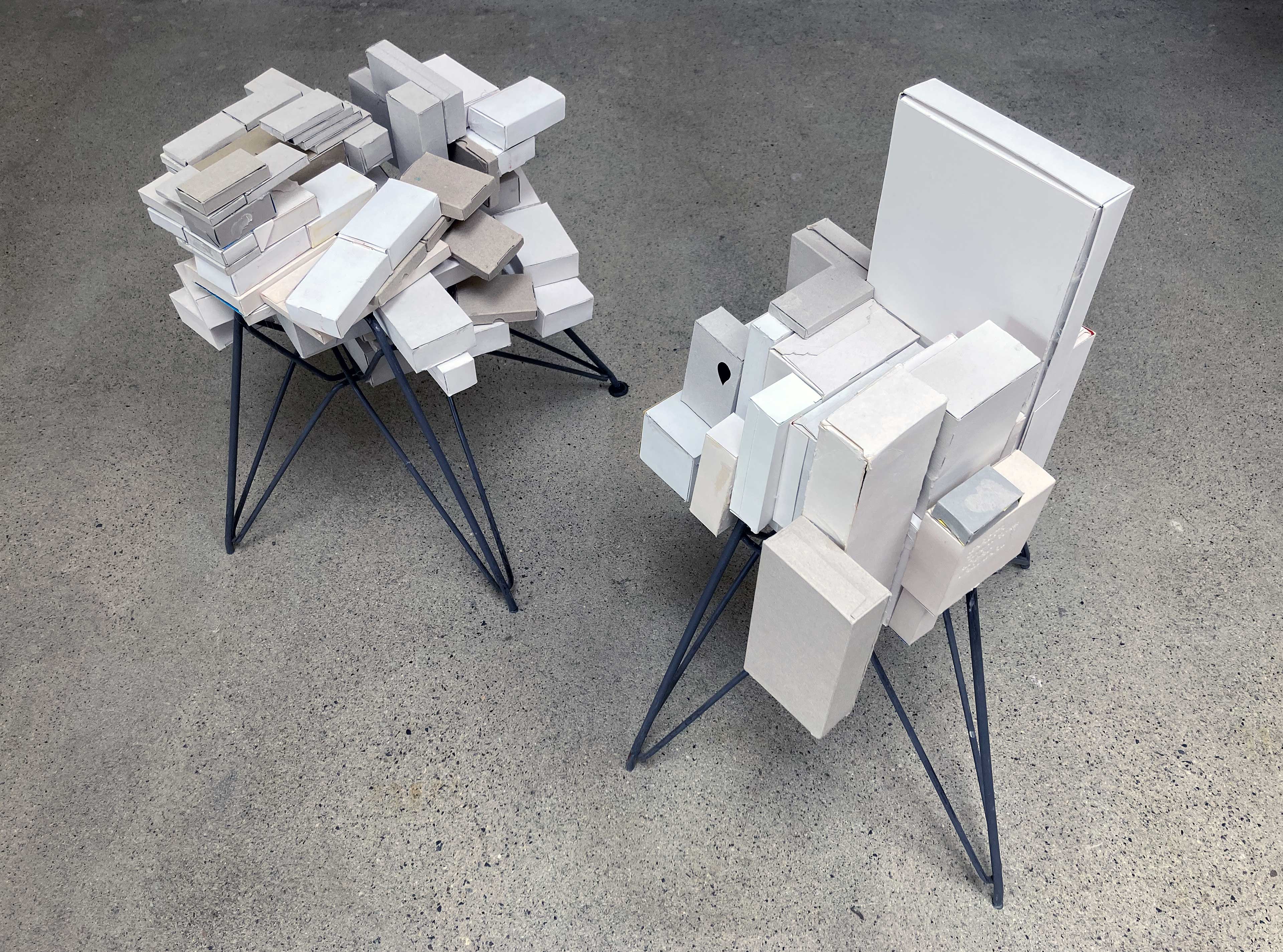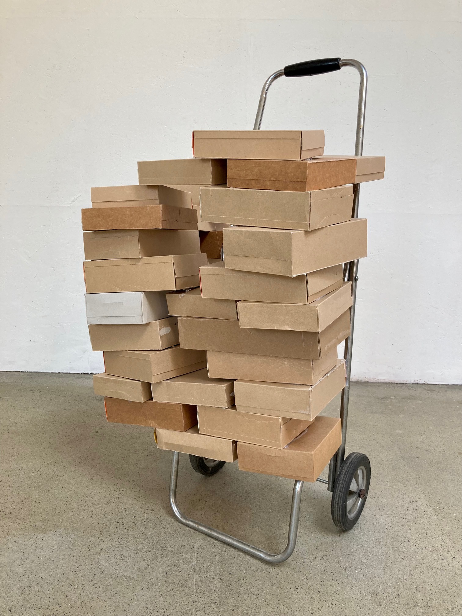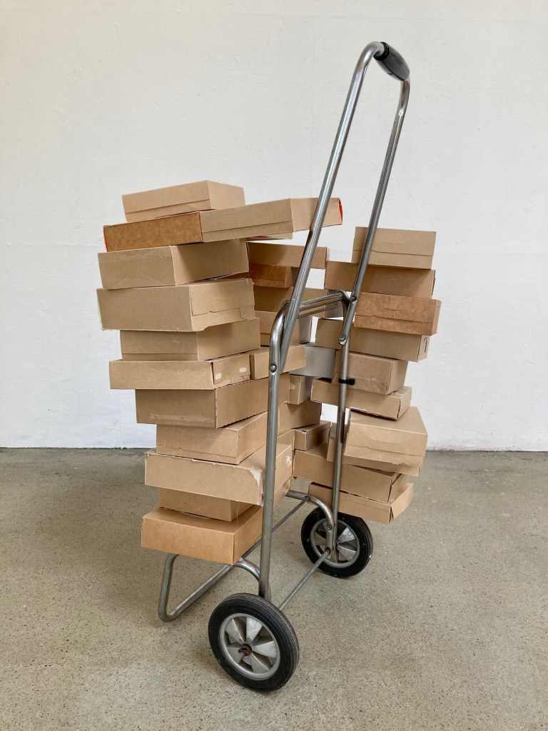 Handgepäck, 2022, Art Spring Pop Up Store, Schönhauser Allee Arkaden, Berlin // Cargo Skulpturen, 2022, mehrteiliges, bewegliches Ensemble für “come on ground” @Landart Eisenberg , Österreich // Trolley, 2022, Wüstentage, Walden Kunstausstellungen Berlin